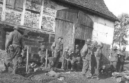 « Désormais, l’ennemi glissait vers la droite pour empêcher la Compagnie E d’atteindre Heuchlingen. La Compagnie H concentra sa puissance de feu sur un coin du bois juste au-dessus du chemin de fer. Tandis qu’une section émettait son barrage de tirs, une autre section tira des fumigènes pour camoufler le passage le long des rails que la Compagnie E s’apprêtait à emprunter. Deux cents tirs de fumigènes furent tirés, protégeant la Compagnie E des fusils automatiques pendant son entrée dans Heuchlingen. Avant de s’engager dans le nuage de fumée, le capitaine Garahan donna l’ordre au lieutenant Pittman de prendre son peloton ainsi qu’une section de mitrailleurs et de longer les bois sur la droite de la compagnie, pour protéger son flanc et s’occuper des Allemands qu’ils trouveraient dans la partie inférieure du bois. Le corps principal de la Compagnie partit pour Heuchlingen à environ 15h40, sous la couverture du grand nuage de fumée de la Compagnie H. Quand ils y parvinrent, ils trouvèrent que les tanks qui les soutenaient étaient déjà dans l’enceinte et avaient capturé trente-huit ennemis qui tiraient au sniper depuis leur position élevée au-dessus de la rivière. Huit membres du peloton anti-blindés du 2e Bataillon étaient arrivés sur les tanks et les avaient aidés à capturer les ennemis éparpillés dans les bâtiments. Le capitaine Garahan donna l’ordre à son peloton d’organiser la défense de la ville et de se préparer à la tenir jusqu’à nouvel ordre. »