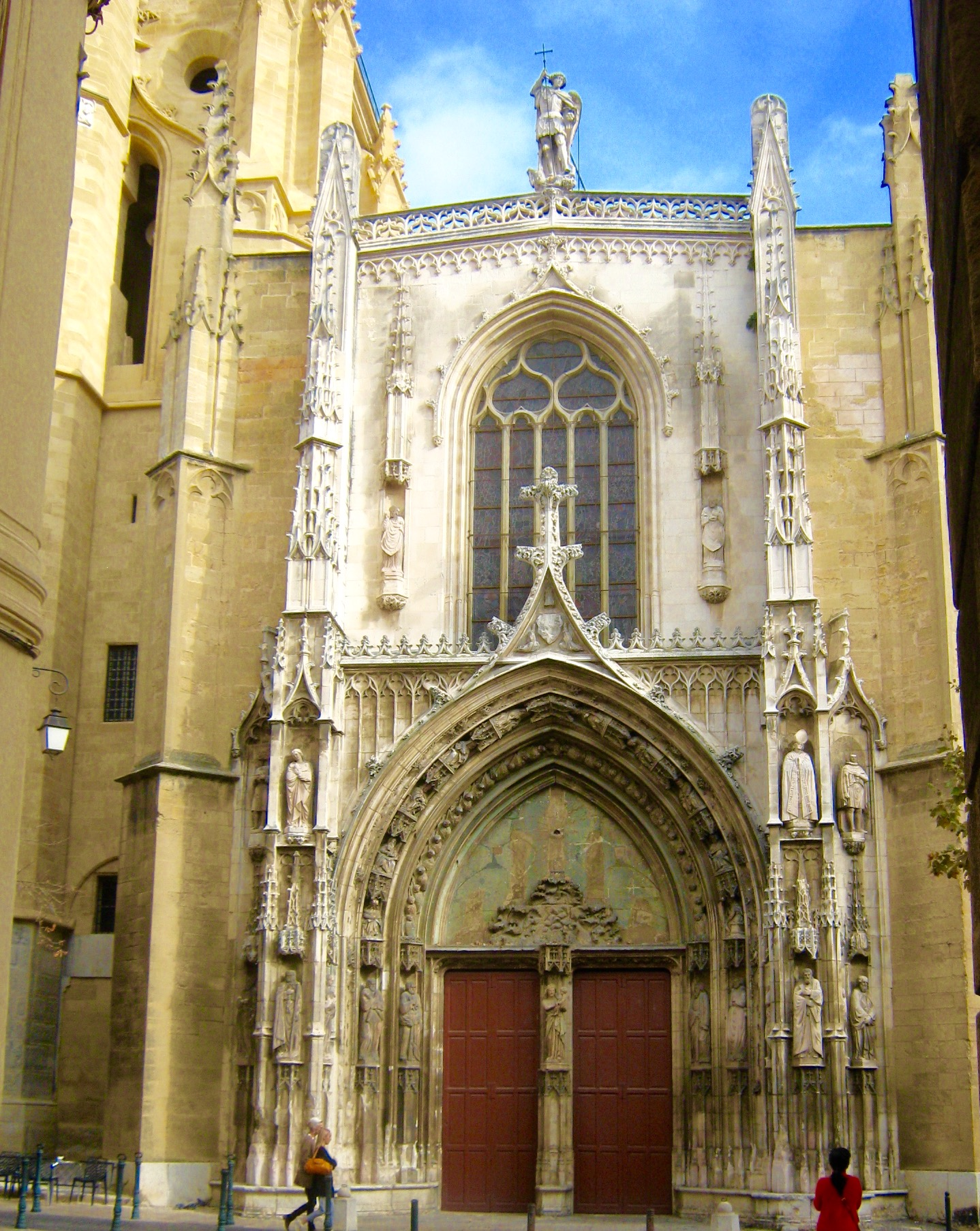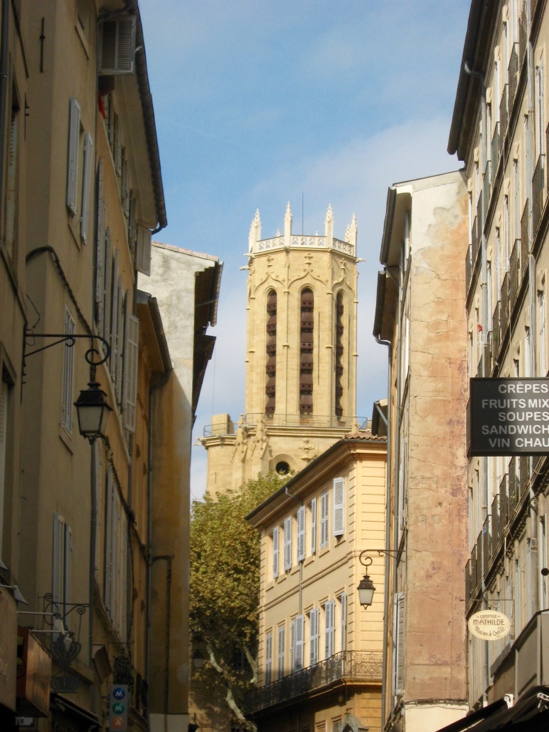 Mon hôtel est situé à l’opposé de la cathédrale Saint-Sauveur, ce qui est idéal puisque je veux voir la cathédrale et me perdre dans les rues ; voir Aix-en-Provence se dérouler devant moi comme elle l’a fait pour Tom. La cathédrale a une tour assez haute pour être vue de loin, mais trouver le chemin pour y accéder est plus laborieux qu’il n’y paraît. Après quantité de mauvais virages, j’ai finalement trouvé une ligne droite vers le monument.