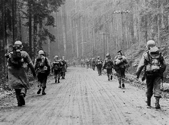 As the troops march along the logging roads of the mountains, note that they maintain a distance of five yards between them to minimize casualties in the event of artillery or mortar fire.
