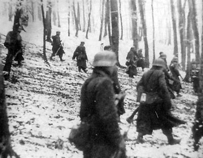 German resistance had become increasingly evident as we approached the gates to Bitche. Artillery fire was heavier and curtains of automatic fire screened strongpoints and towns. At the slightest provocation, the Germans poured in artillery. For the next two days, the Regiment moved with caution as it jockeyed into position for the attack on Reyersviller. Then suddenly on 13 December like a cloudburst, the 398th swept in upon Reyersviller behind a rolling barrage of artillery fire from the 375th Field Artillery Battalion. With the 2d Battalion in the lead, pillboxes and strongpoints, which only a short time ago were spitting fire and raking the terrain before them, were blasted open. The Krauts who could, came stumbling out to surrender. The battalion continued on to the high ground north of Reyersviller with